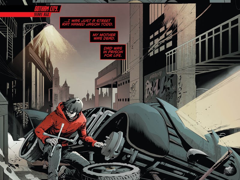 Returning to the series is writer Scott Lobdell (best known for X-Force in the ‘90s) with artist Dexter Soy and colorist Veronica Gandini. In the preview of the comic below, the trio show they’re a well-oiled machine, with Lobdell doing well to humanize the first meeting between Batman and Jason, who was trying to jack tires off the Batmobile. Among bleak shades of black, tan, and gray, there’s ample amounts of sharp red that foreshadows Jason’s bloody and rage-filled future.