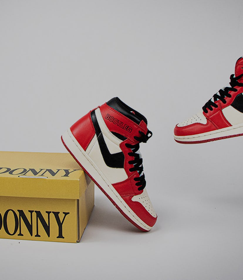 Inspiration and irony — The "Donny 1" sneakers are a spin on a knockoff pair of AJ1s created by a brand called Pro-Joggs back in the 80s, featuring the same high-top design, red-and-white, Chicago Bulls-themed, and sort of a hockey stick logo that replaced Nike's swoosh on the silhouette. Pro-Joggs' "Chicago" sneaker wasn't designed to fool anyone into thinking they were buying a real Air Jordan 1 — it was there as an alternative for people who have zero concern for the status quo.
