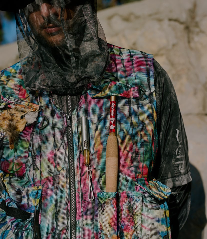 Fleece jackets, the ultimate fodder for gorp devotees, also appear and are sure to be one of the most difficult cops. There’s also a long-sleeve T-shirt if costume-esque dressing is less your thing, and the accessory front is representing by a mesh game bag and hats of the jungle, bush, and balaclava variety. Crucially, Supreme and South2 West8 have also crafted a co-branded Tenkara fishing rod — and we just hope they’re put to good use instead of being mounted on the walls of a bunch of dorks’ Ikea-decorated apartments.