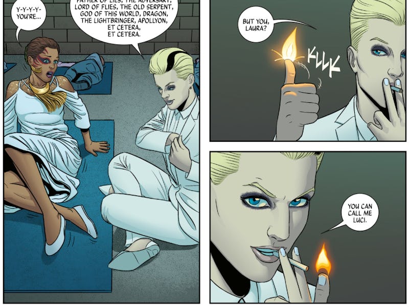 Lucifer dominates every page she’s on in The Wicked and the Divine. She’s all poise and attitude, half-knowing smile, half-sarcastic snarl, all white suit. The story is told from the point of view of the fangirl Laura, but the first five issues that comprise the opening story (and trade paperback) are Luci’s story, with her presence hovering over the panels she’s not part of.
