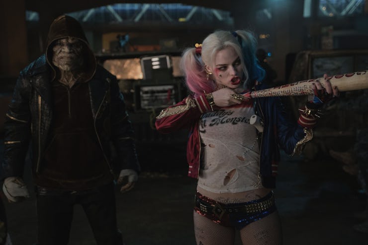 Margot Robbie’s aesthetic with a skin tight t-shirt, booty shorts, fishnets, and a belt stolen from Hot Topic is a far cry from how the character has looked in previous canon. Previously, she’s worn a unitard and joker hat without a single sign of Hot Topic in sight.