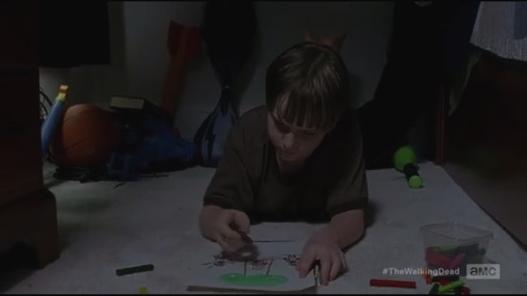 The Walking Dead used Lucas’ warbling as diegetic music in the final episode of Season 6’s first half when creepazoid kid Sam played it on his child-sized record player — a tripped out toy for a kid to mysteriously have post-apocalypse — to provide a nice backdrop for his violent coloring project. The song immediately signaled that Sam was going to be a problem by the time the episode was over.
