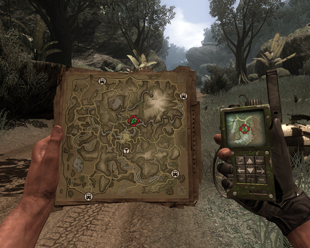 It’s part of the game world. The same button you use to focus your sight on things in the game world is the button you have to use to look at the map in detail. It’s also a deliberate homage to one of the most critically-beloved games of recent years, Far Cry 2 and its map. Much like the disposable camera, the in-world map is a deliberate minor annoyance that holds the player’s attention on things that are normally treated as conveniences.