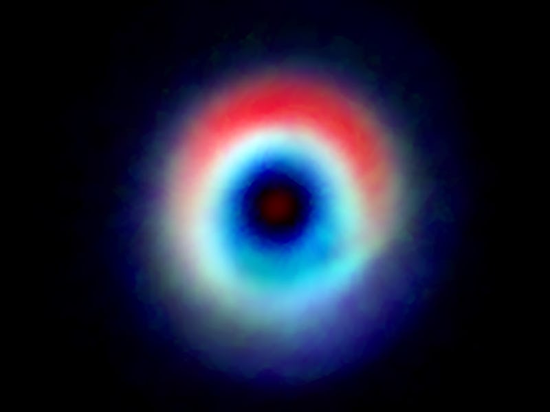 Around these star-crossed lovers is a pretty significant amount of dust and gas. Under the right gravitational force, this stuff usually collects together into celestial bodies we call planets. HD 142527, the ALMA scientists discovered, has a planetary disk in the same of broad elliptical ring. It’s way out there — about 50 times farther from its host star(s) than the Earth is from the sun.