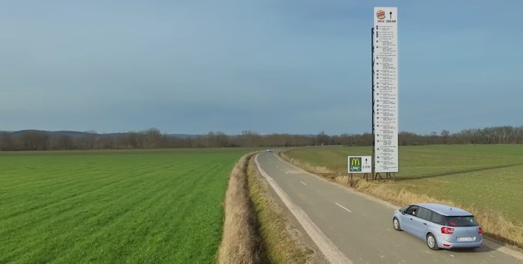 TBWA Paris, the Golden Arches’ advertising agency in France, erected two temporary billboards between Brioude and Fontannes. In this part of France, the nearest Burger King drive-through is not at all nearby — in fact, this location was chosen for the simple fact that it was the longest distance between a so-called “McDrive” and a Burger King drive-through. One billboard announces that there’s a McDrive just 5 kilometers up the road, a good crisp jog away. A second billboard, adjacent to the McDrive one, gives drivers turn-by-turn directions — “recommended by Viamichelin” — to the closest Burger King drive-through. And that drive-through is 258 kilometers, or a whopping 160 miles, away.