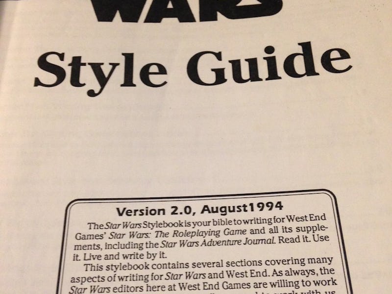 It’s tough to unify books, video games, comic books, toys, TV shows, and movies in modern times, let alone way back in 1994. It was then that West End Games, who paved the way for the expanded universe by creating a series of comprehensive Star Wars roleplaying games, sent out a style guide stipulating what official creators could or could not do to in a post-Return of the Jedi, pre-The Phantom Menace world. It just so happens that Hidalgo is also highly active on Twitter, and today tweeted out some pages from that 1994 style guide. It has some tough but fair truths for the prequel trilogy and even the newly minted sequel trilogy.