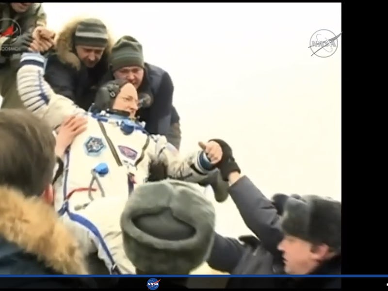 Kelly touched down at 11:26 p.m. Eastern time on March 1 in a Soyuz spacecraft, packed in with two Russian colleagues, Mikhail Kornienko and Sergey Volkov. Kornienko and Kelly spent almost an entire year in space, the longest continuous mission to the ISS in history.