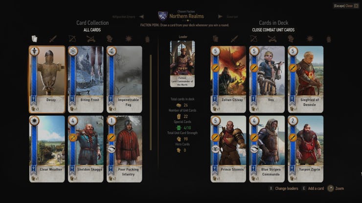 Gwent is a playing card game critical within The Witcher universe. Designed by dwarves and refined over the years through hundreds of tavern games, Gwent is simple to play but difficult to master. Game take place between two different players, who control a deck centered around a faction within the game – each with a different ability. Players then build their decks from a variety of close, ranged, siege, and ability cards as they see fit before diving into the taverns looking for a match.