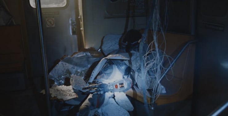 Did you find him hard to make out when he flashed by in the first moments of the episode? He looked something like a Power Ranger, in a helmet with a larger black visor. The definitively alien detail, however: a long, four-fingered gloved hand. Unclear how big this thing is to scale, but we can look forward to a detailed investigation next week. See for yourself below: