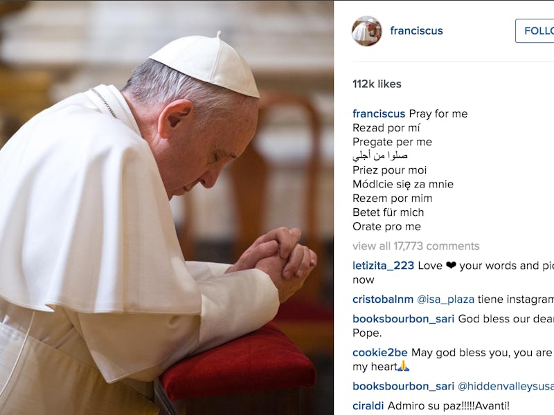 It seems appropriate that Pope Francis’ first Instagram post is of him clasping his hands in prayer and that the majority of the photo’s comments were none other than the praying emoji.