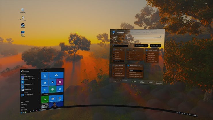 The Virtual Desktop is a bit more than what it sounds like. The interface itself is customizable: You’re able to control the zoom, make the “screen” appear curved, and also render the “desktop” itself transparent, such that it blends in with the background. As for these environments: you can use one of several packaged with the application or instead build your own.