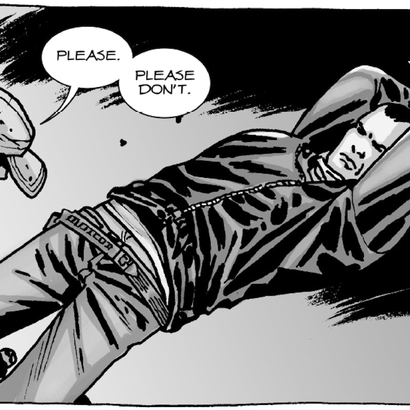 Rick and The Governor, as similarly straight-forward, masculine archetypes, understand each other. Negan arrives to the scene with a series of uncomfortable panels. He has an adolescent’s sense of humor, and a teen boy’s petulant voice. He’s the kind of punk Rick should be able to take out, the kind of boy a dad would never let his daughter go on a date with, and yet he humiliates and pulverizes the comic’s heroes so swiftly that the reader’s guts hit the floor. Negan is terrifying to a very particular group of readers: those who accept and adore The Walking Dead’s code of conduct: that honorable men will be rewarded for their courage and sacrifice, and that honesty and conservative ideals of family will win out in the end.