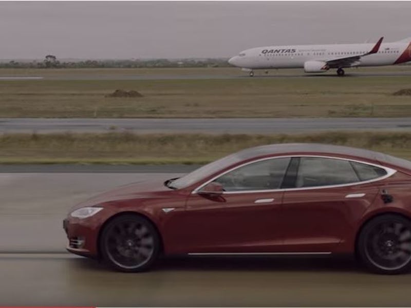 The Model S offers a setting called “ludicrous” acceleration, as does the Model X. It also does 0-60 in 2.8 seconds, without burning a scrap of fossil fuels. Unfortunately, there isn’t an electric-only option to the Boeing 737, which burns a hell of a lot of fossil fuels, but Qantas wants to market itself as an environmentally-friendly airline, so racing one of their planes with a Model S seemed like the thing to do.