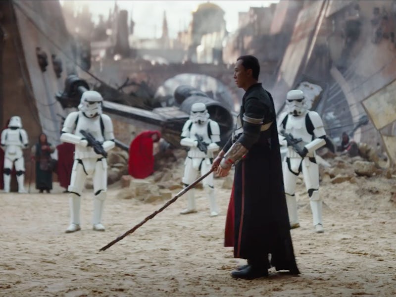 In a universe dominated by Force powers, lightsabers, and blasters, Rogue One appears ground-level gritty, featuring a character who knows how to fight without any of those fan-favorite, high-tech weapons. Yen, as seen in the trailer, sports a fragile-looking wooden stick but uses it as a quarterstaff to anihilate a few Stormtroopers.