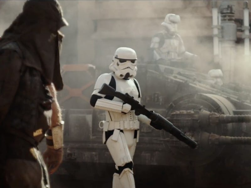 The new tan stormtroopers show up in the background of the teaser on the other side of the platform from the shot where actress Felicity Jones is seen running with who is presumably Diego Luna and an unnamed droid. These guys are seemingly equals to the retro troopers, and their role is unclear, but their similarities to the white and black scout trooper designs that show up in Return of the Jedi make it seem like they might be tactical troopers of some kind.