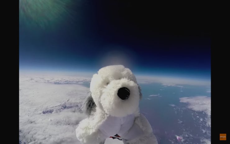 Sam had an incredible ride up into the stratosphere. Posing in the foreground of a camera attached to a helium balloon, Sam’s plastic eyes watched as the clouds parted and the curvature of the Earth came into view. The students on the ground were even able to track Sam’s location using a GPS device attached to the flying contraption. Tragically, once the balloon popped, Sam broke off from the rest of the device, leaving the toy dog to plummet back to Earth all on its own.
