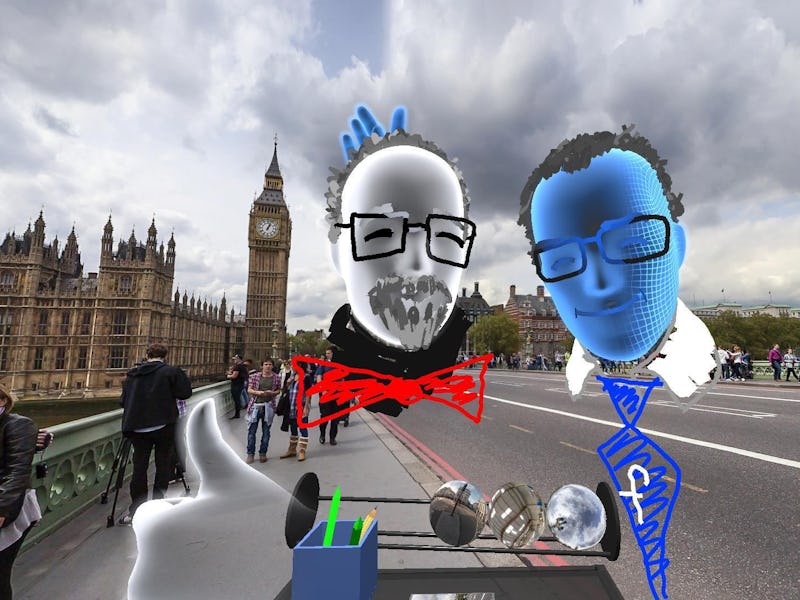Schroepfer and Booth gave each other photosphere bubbles. Booth would hand Schroepfer a bubble, Schroepfer would dunk his head in said bubble, and they’d both be transported into that bubble’s world. Each bubble contained a high-definition 360-degree photo. The pair traveled all over the world, winding up in London near Big Ben. Conveniently, in said 360-degree photo, a couple was taking a selfie — which led Booth and Schroepfer to take their own selfie.