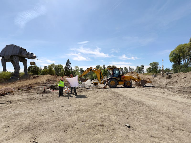 The teams behind the Star Wars-themed lands at Disneyland and Walt Disney World are breaking ground today. A 360-degree photo from Disney gives us a (very) early look with special appearances by some familiar characters.