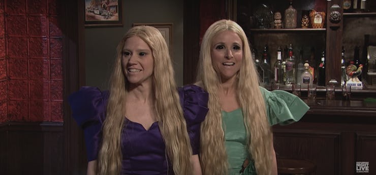 Enter Julia Louis-Dreyfus and Kate McKinnon wearing frazzled, blonde Rapunzel wigs, blacked-out contact lenses, and dresses that look like wardrobe from a low-budget Enchanted spin-off. If that didn’t tip off the audience to their otherworldly origins, the green light, fog machine, and deep-voiced declaration that the duo “must find men for dating” surely did. And the screeches, of course.