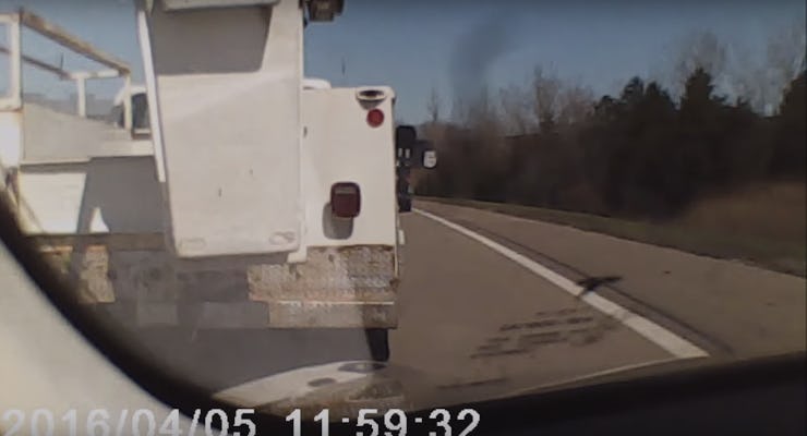 In a blink-and-you'll-miss-it maneuver, the car veers away from a boom truck.