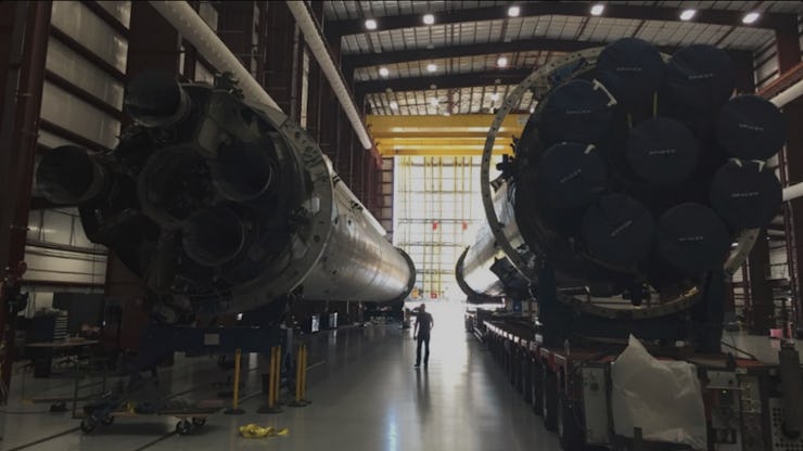 It’s important for both rocket-based spaceflight companies to be able to re-use the first stage parts of their rockets, in order to keep flying a string of resupply missions, satellite launches, and eventually tourism trips, and orbit trajectories mean the rockets can’t always come down on land. Musk is predictably stoked about finally landing a Falcon 9 on his drone ship Of Course I Still Love You, and the rocket’s return to the hangar and launch pad from the sea has been an exciting, hilarious journey. But it’s back, and Musk wants the world to know. We’re assuming that’s Musk, standing silhouetted against the light from outside the hangar and in between the two enormous Falcon 9s.