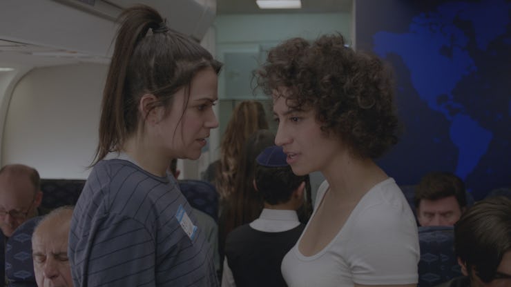 Abbi breaks out into a rendition of “Hark! The Herald Angels Sing” as a diversion so that Ilana can charge first class and snag a tampon for Abbi, but their efforts are thwarted when the flight attendants, who think Abbi and Ilana are scheming a terrorist attack, tackle them both to the ground. They’re questioned by Israeli forces when they land in Israel, and are sent back on a plane to New York when their stories don’t add up.