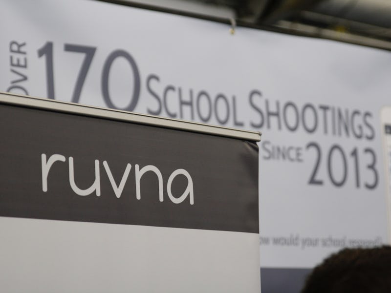 One thing that’s striking about Ruvna’s display at TechDay, however, is its headline statistic, plastered on a big banner above the table. “Over 170 school shootings have occurred since 2013,” the banner says. “How would your school respond?”