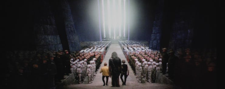 “[I]t required, artistically, a clever way to make the environment regal and massive,” he says. “Part of the reason the shot works so well is the dramatic glow in the distant background almost obscuring Leia and the other characters. The John Williams fanfare on the soundtrack is the final perfect touch.”