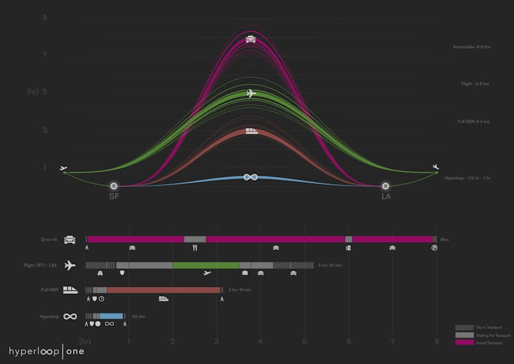 A flight (with the required TSA processing) is about five hours, 20 minutes, according to the graphic, and high-speed rail’s still about three hours, 10 minutes. The Hyperloop One hyperloop boasts a grand total of 50 minutes — including time to and from the station.