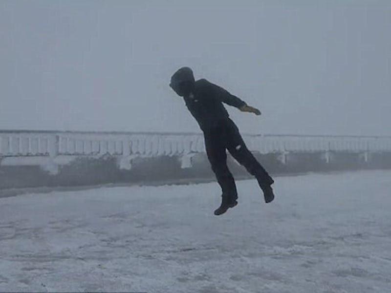 It was pretty windy at the Mount Washington Observatory in New Hampshire on Monday — scientists there recorded winds whistling through at 109 miles per hour. That’s the empirical way of measuring it, but weather observers Mike Dorfman and Tom Padham decided that looking at read-outs from finely tuned scientific experiments was kinda boring, so they decided to go up to the roof and jump around a little. And by a little I mean a lot, because the wind tossed them around like rag dolls on the Observatory’s ice-covered observation deck.