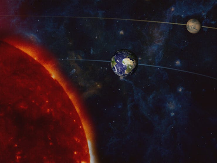 Since Earth is closer to the Sun and has a shorter orbital path than Mars, it takes our planet roughly two revolutions before Mars can make one. That means sometimes the planets are on opposite sides of the sun, known as Solar Conjunction, and sometimes, like tonight, Mars and Earth are on the same side as the sun.