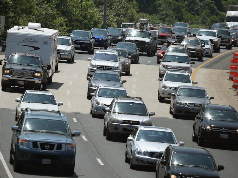Cars sit in miles-long traffic jam on southbound highway 101 as they approach a flooded section of the freeway on December 3, 2014 in Mill Valley, California. The San Francisco Bay Area is being hit with its first major storm of the year that is bringing heavy rain, lightning and hail to the region. The heavy overnight rain has caused flooding which has blocked several roadways and caused severe traffic backups.