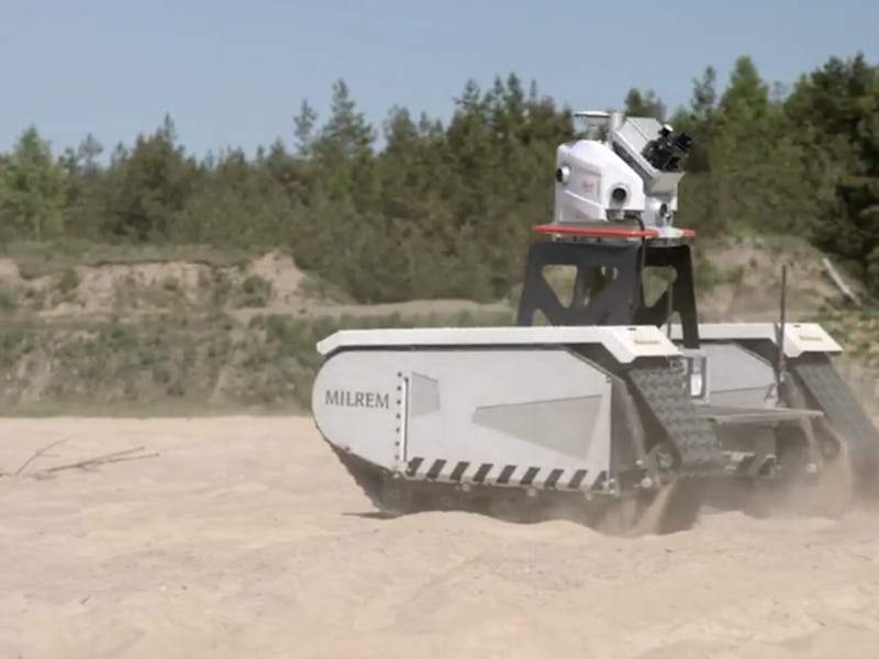 Leica Geosystems has a super-sensitive all-seeing camera tower which fits perfectly, turning the THeMIS into the military equivalent of a Google Street View car that can trundle around battlefields, borders, or just rough terrain, scanning for threats, mapping the land, and taking pictures. The company says the Leica-Milrem collaboration gives civilian contractors another option for surveying dangerous terrain like riverbanks and dams, as well as offering other surveillance options to military and defense organizations.