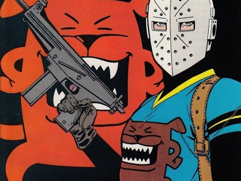 He suits up in a makeshift costume: Hockey mask, oversized football jersey to hide his body armor, camo pants, electrified gloves, and a 9 mm machine gun. He gets the name “Wild Dog” when, in his first issue after he rescues a reporter from a hostage situation, a SWAT captain orders his men to shoot him down “like a wild dog” in the street.