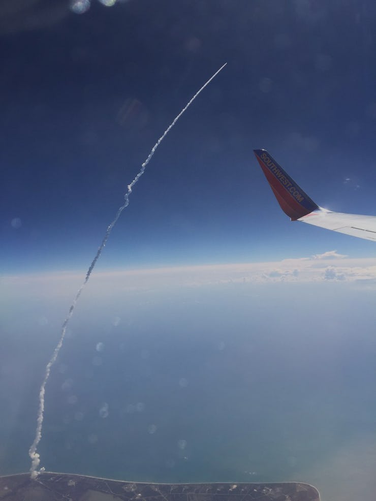 The pilot was telling everyone to look out the left side windows, which Kennedy had been sleeping on. Pilots will occasionally point out sights or scenery on flights, but this one was a rare sight — the plane passed over Cape Canaveral, Florida just as United Launch Alliance launched a tricked out Atlas V rocket loaded with a Navy satellite into space.