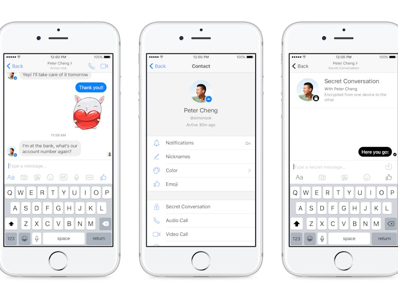 “Your messages and calls on Messenger already benefit from strong security systems — Messenger uses secure communications channels (just like banking and shopping websites) as well as Facebook’s powerful tools to help block spam and malware,” Facebook said in its announcement of secret conversations. “We’ve heard from you that there are times when you want additional safeguards perhaps when discussing private information like an illness or a health issue with trusted friends and family, or sending financial information to an accountant.”