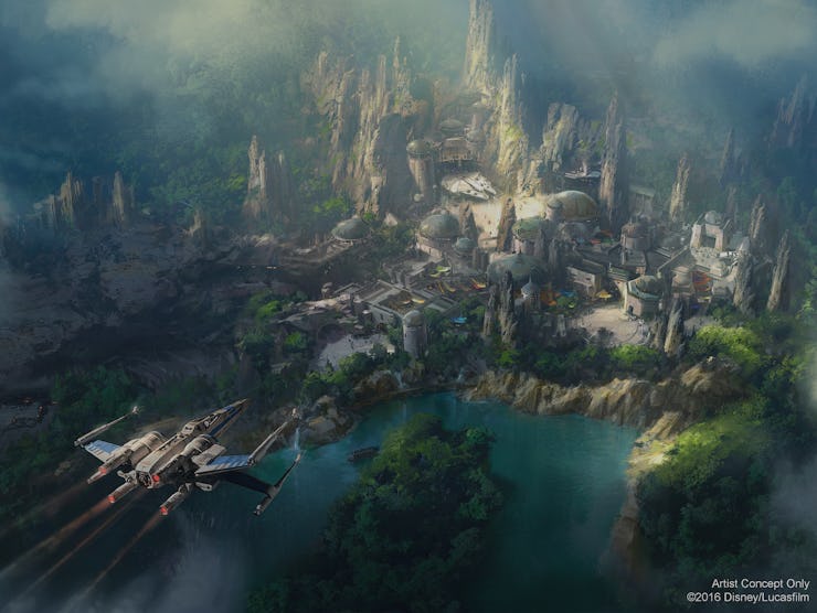 The image seems to be a spruced-up version of the view of the park — which is rumored to be called the Star Wars Experience — previously created by Disney Imagineer Greg Pro, that surfaced in April. The blog points out that a version of the image is hanging up in front of where the actual park will go in Disneyland, so it’s probably the most final version of the layout we’ll see until we see the real thing.