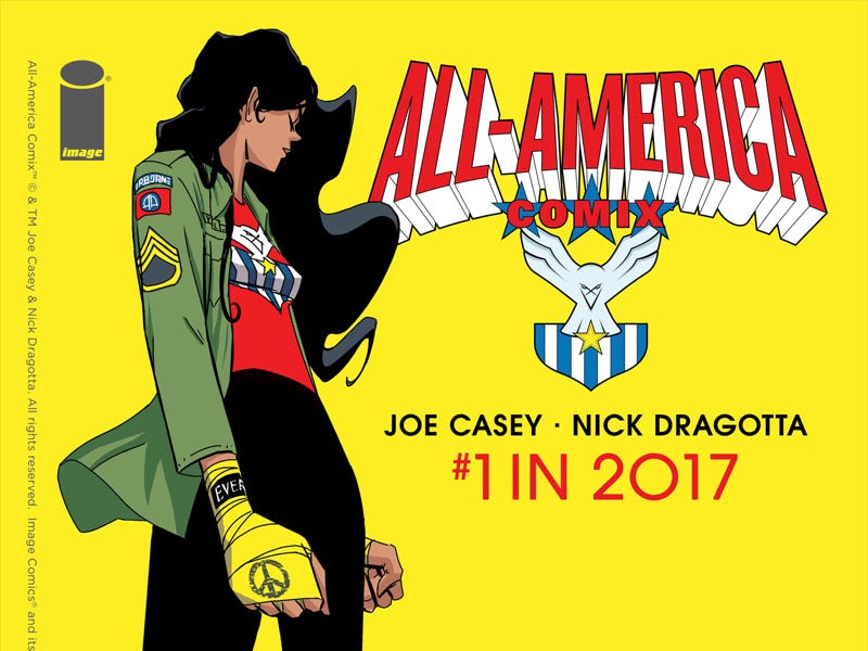 First, the actual news: All-American Comix is coming to Image Comics from creators Joe Casey and Nick Dragotta. The first issue’s set to drop in 2017, and the series stars a young woman of color described in the promo material as “[a] superpowered champion of the oppressed” that explores the mysteries of the universe and the secrets therein. That and the promo image are basically it for the time being as far as knowing what the series is actually about.