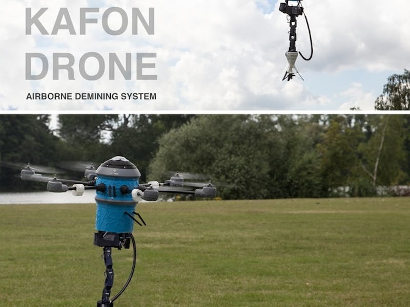 The drone can also detonate mines itself — and it does it without sacrificing parts of it’s body, like the original rolling Kafon. It can be fitted with a robotic arm that can deliver a small detonator payload to a buried mine, which will blow up the charge safely away from demining personnel.