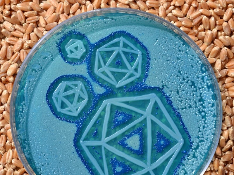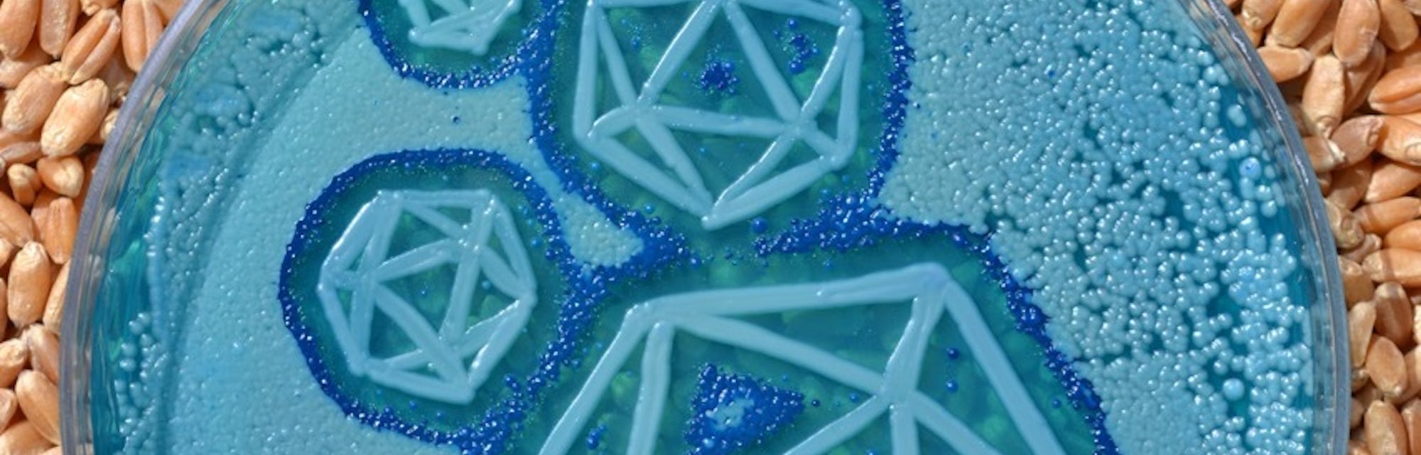 But, if you get all of this right, the magic happens. Rowley demonstrates this to students and the world at large by covering a petri dish with a thin layer of the strain of yeast that is sensitive to the toxin. On top, he paints on the killer yeast strain in, say, the classic icosahedral shape of a viral capsid. As the culture develops, the killer yeasts should do well and inhibit growth in nearby areas. The medium is dyed with methylene blue, and concentrates in the regions of cell death, showing in a clear picture the signature of a killer.