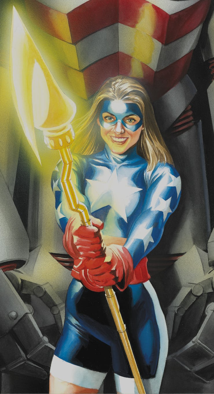 A trained gymnast and kickboxer, she is the step-daughter of Pat Dugan, sidekick to the first Star-Spangled Kid whose equipment she discovers in a garage. When Courtney begins fighting crime, Pat builds a giant robotic suit (named S.T.R.I.P.E.) which he uses to provide her with assistance, once again assuming sidekick duties. Eventually, Courtney joins the JSA, and after being gifted Jack Knight’s cosmic staff — which among other things, gives her the ability to fly — she changes her identity to Stargirl.