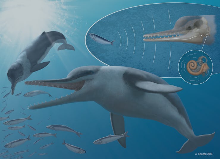 The American and French scientists analyzed the specimen’s preserved bones, including the tiny structures of the ear. They found that the ear bones had the structures that would allow it to hear high-frequency sound, similar to toothed whales living today. Further, they found facial structures in the skull that indicate the presence of air sacs that would have allowed the animals to produce ultrasonic noise and use this as sonar to locate and chase down prey.