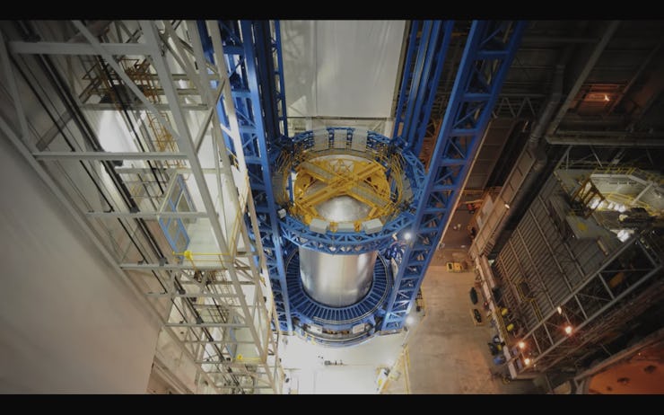 It’s a pretty incredible sight — the rocket’s giant fuel tank seems to materialize almost instantly as cranes and scaffolding shuffle around its exterior. Bonus points for NASA’s way-too-intense metal/dubstep soundtrack, which makes the whole thing sound like the trailer for a new God of War game or something.