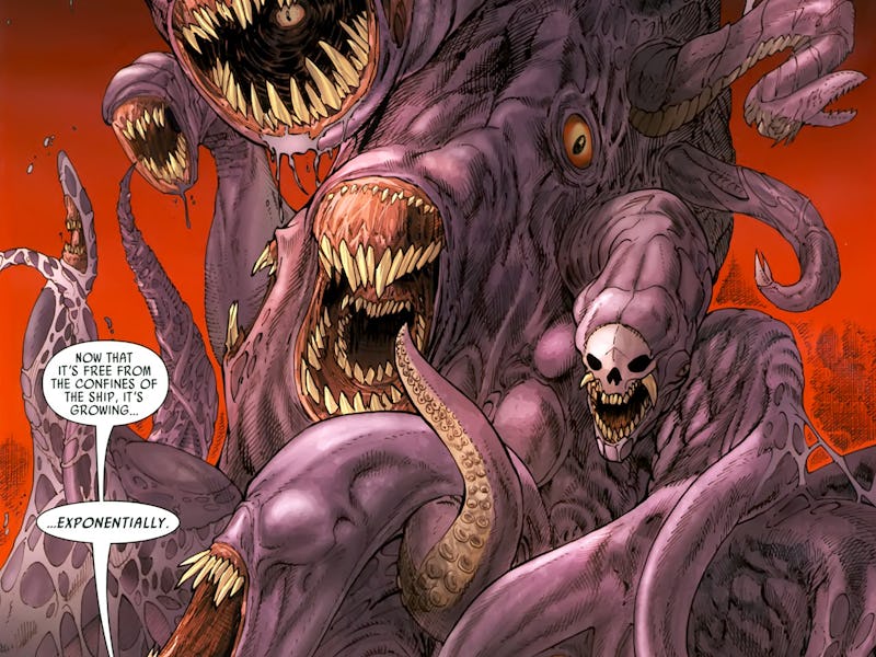 The creature illustrated in the artwork could be The Many-Angled Ones from the Marvel comics. These creatures come from a Lovecraft-inspired dimension populated entirely by Eldritch Abominations. As a result, the universe came to be known as the Cancerverse and the Many-Angled Ones a prominent enemy of the entire Marvel Universe.