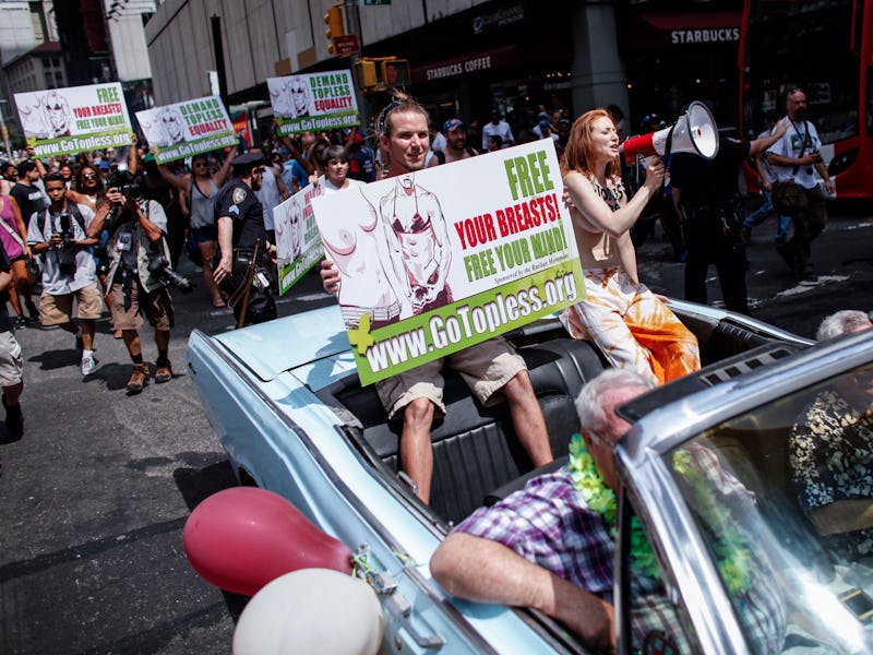 Today is Go Topless Day, where women across America take off their shirts to support gender equality and to celebrate — or, in places where it’s still illegal, to protest for — the right to walk around topless just like men can, while men show solidarity by wearing bras or bikini tops. Since the event was first organized in 2008, participants have taken to the streets in more than 40 cities across the United States and around the world.