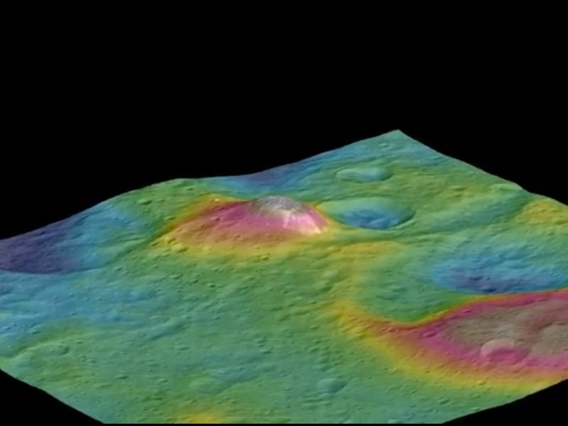 The most exciting discovery? There’s reason to believe that that Ceres hosts a cryovolcano — which is as awesome as it sounds. Cryovolcanoes function physically like a volcano on Earth, except in a much colder system. They are not fed by molten lava, but by a mix of water and volatile compounds trapped underground. This slurry becomes heated and pressurized until it erupts through the crust, flowing like lava until it solidifies as ice on the surface.