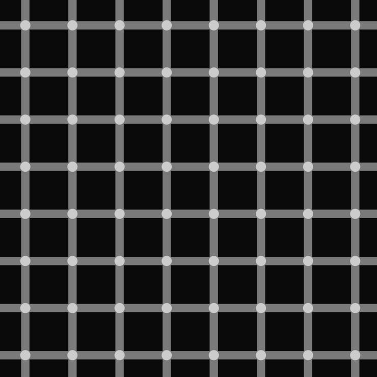 Why does this illusion happen? Lateral inhibition is a physiological mechanism rooted in the retina, causing the brighter surroundings to an area seem darker; in turn, darker surroundings appear lighter. So if you have dark gray bands surrounding a white area on a grid, the black dots you’re not focusing appear to be invisible. Essentially, lateral inhibition keeps the light receptors of the retina from firing off and makes the eye perceive more light or darkness than there actually is. It doesn’t matter what colors are where, as long as they are very contrasting.
