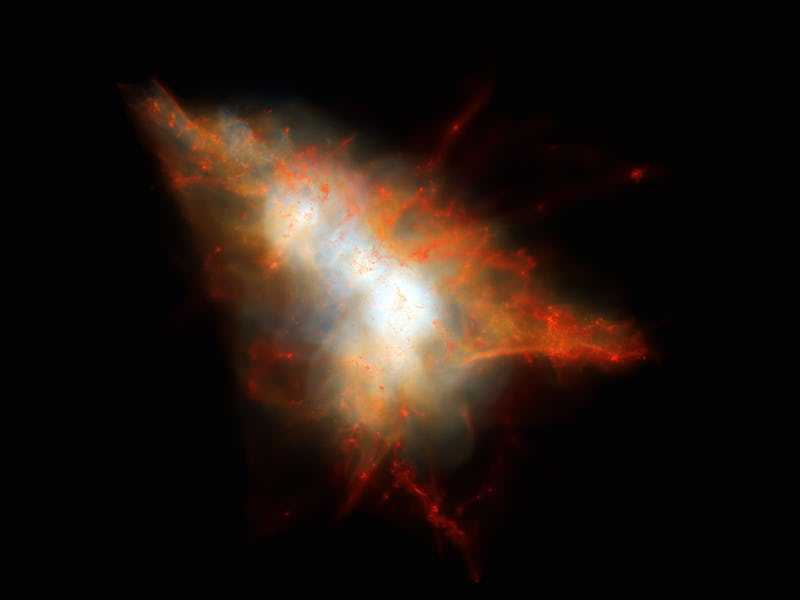 Using the Atacama Large Millimeter/Submillimeter Array (ALMA) located in Chile, the research team took a closer look at the first ever discovered lab, affectionately named SSA22-Lyman-alpha blob 1, or LAB-1. Identified in 2000, LAB-1 is about 11.5 billion light-years away. In analyzing the light emitting from the cool dust clouds, the team found out there are a pair of galaxies at the heart of LAB-1 that are experiencing a frenzied birth of stars right now — at a rate over 100 times that of the Milky Way. For some context, the Milky Way typically spawns about seven new stars in a year. That means that a Lyman-alpha blob is pumping out roughly 700 new stars in the same time period.