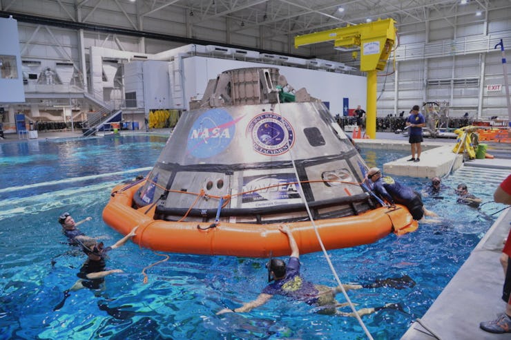 Orion was placed in NASA’s massive testing pool — the Neutral Buoyancy Laboratory — at the agency’s Johnson Space Center in Houston. A group of U.S. Navy divers, Air Force pararescuemen, and Coast Guard rescue swimmers came out to the floating craft to practice recovering the capsule, connecting cable lines that, in the real word, would tie to a Navy ship.