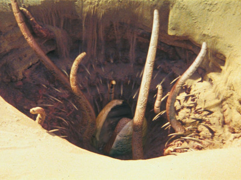 If the Sarlacc were not an imaginary beast, it would most likely have been related to the now-extinct Pambedelurion and penis worms as well. They’ve all got the same “circlets of teeth,” “radially-arranged oral plates,” and “pharyngeal teeth,” as the Palaeontology paper notes. But penis worms — and possibly the Pambedelurion — are not sand-bound, like the Sarlacc; they’re known to use their mouths not only to eat but for locomotion, hooking their teeth onto fixed objects in order to drag their phallic bodies around.